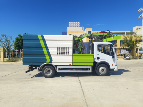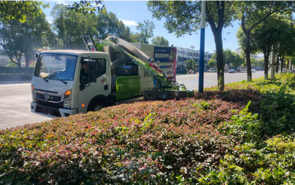绿化综合养护车主要由汽车底盘、动力系统、工作臂系统、修剪系统、液压系统、电气系统、风机系统、回收系统等组成。